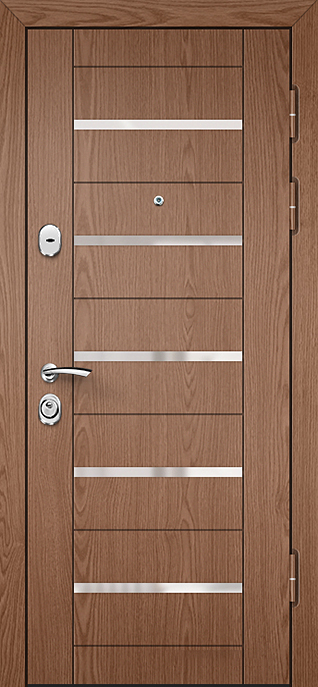 Входная дверь с зеркальным полотном №53 выделяется тем, что зеркало занимает почти всю внутреннюю поверхность, превращая дверь не просто в защитный элемент, а в полноценную часть интерьера. Такое решение особенно удобно для квартир и офисов, где зеркало необходимо ежедневно, а отдельное место для него найти непросто. Каркас изготовлен из профильной трубы и усилен рёбрами жёсткости, стальной лист толщиной 2 мм обеспечивает прочность и устойчивость к нагрузкам. В отделке использованы панели МДФ с ПВХ-покрытием, которые стойко переносят повседневные испытания и сохраняют внешний вид долгие годы. Два контура уплотнения защищают от сквозняков и уличного шума, а возможность выбрать размеры и направление открывания позволяет адаптировать модель для частных домов и городских квартир. Входная дверь с зеркальным полотном №53 от производителя: быстрое изготовление и монтаж в Щербинке, индивидуальные размеры, широкий выбор материалов и фурнитуры, официальная гарантия до 10 лет.